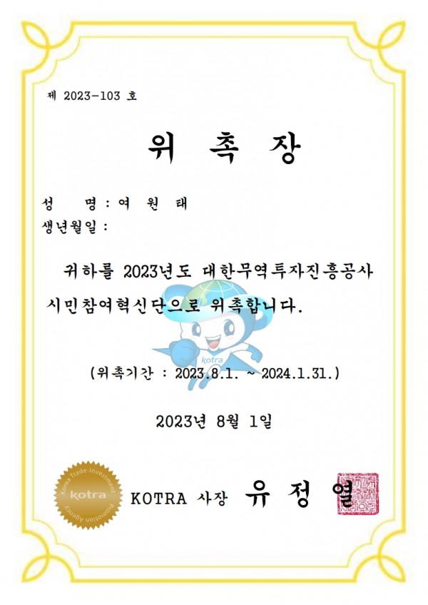 Letter of Appointment of KOTRA Citizen Participation Innovation Group 관련링크 mondereve 547 0 본문 Letter of Appointment of KOTRA Citizen Participation Innovation Group SHARE THIS PAGE 목록
